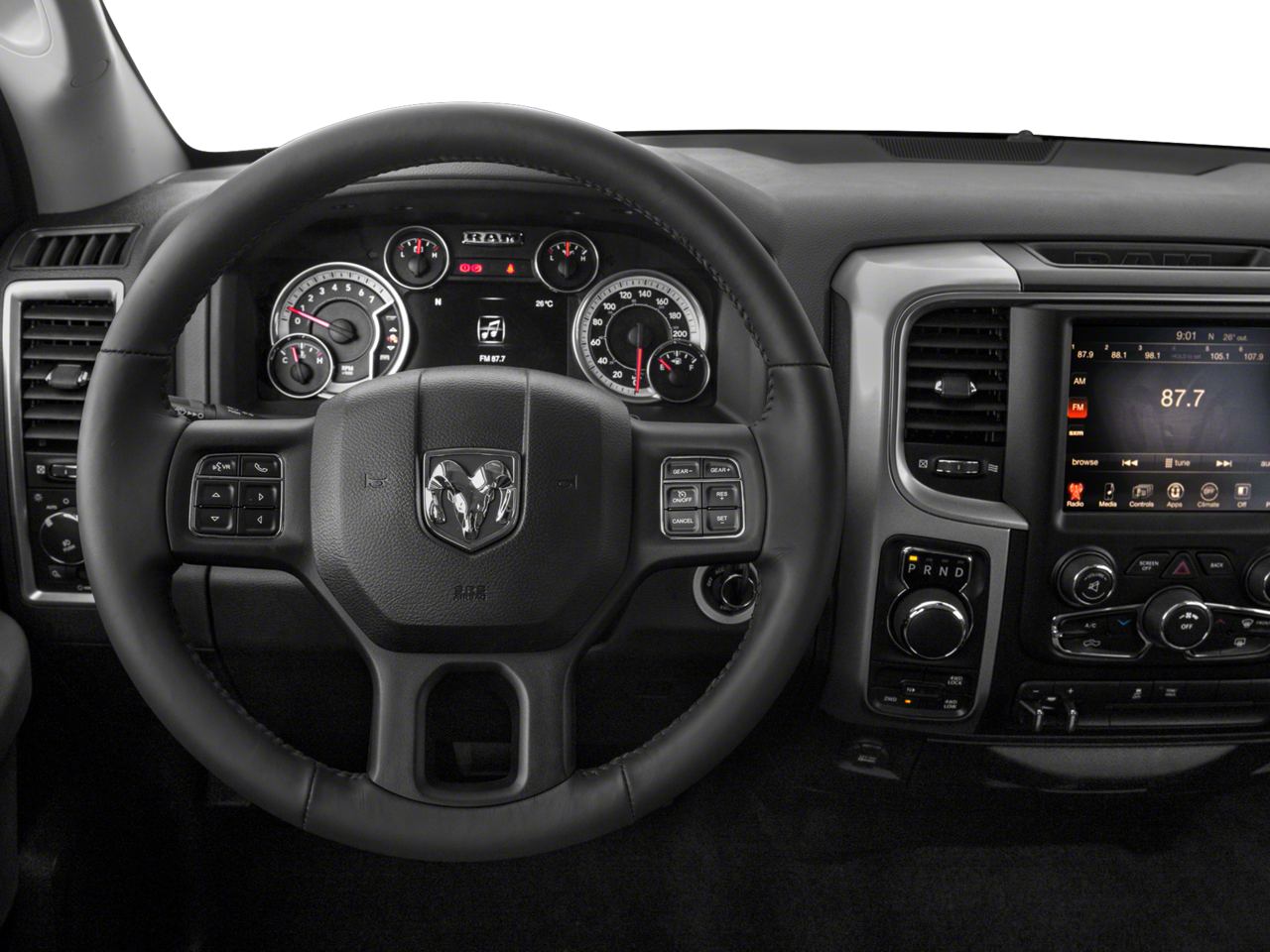 Equipped with Big Horn Regional Package, Heated Seats & Wheel Group (DISC) (Heated Front Seats and Heated Steering Wheel), Quick Order Package 26S Big Horn (115V Auxiliary Power Outlet, 40/20/40 Split Bench Seat, 6 Month Trial (Reg. Required), 6 Month Trial (Registration Required), 8.4 Touchscreen Display, Air Conditioning ATC w/Dual Zone Control, Audio Jack Input for Mobile Devices, Auto-Dimming Exterior Mirrors, Auto-Dimming Rear-View Mirror, Big Horn Badge, Bright/Bright Billets Grille, Charge Only Remote USB Port, Class IV Receiver Hitch, Dual Rear Exhaust w/Bright Tips, Electric Shift-On-Demand Transfer Case, Electroluminescent Instrument Cluster, Exterior Mirrors Courtesy Lamps, Exterior Mirrors w/Supplemental Signals, Fog Lamps, Folding Flat Load Floor Storage, For Details Visit DriveUconnect.com, Front Armrest w/3 Cupholders, Front Center Seat Cushion Storage, Glove Box Lamp, GPS Antenna Input, Integrated Voice Command w/Bluetooth®, Leather Wrapped Steering Wheel, LED Bed Lighting, Media Hub (USB, AUX), Nav-Capable! See Dealer for Details, Overhead Console w/Garage Door Opener, ParkSense Front/Rear Park Assist System, ParkView Rear Back-Up Camera, Power 10-Way Driver Seat, Power Heated Fold-Away Mirrors, Power Lumbar Adjust, Power-Folding Mirrors, Premium Cloth 40/20/40 Bench Seat, Radio: Uconnect 3C w/8.4 Display, Rear 60/40 Split Folding Seat, Rear Dome w/On/Off Switch Lamp, Remote Start System, Remote USB Port, Security Alarm, SIRIUSXM Satellite Radio, Steering Wheel Mounted Audio Controls, Storage Tray, Sun Visors w/Illuminated Vanity Mirrors, Uconnect Access, Underhood Lamp, Universal Garage Door Opener, and Wheels: 20 x 8 Aluminum Chrome Clad), 1 Yr. Trial (Registration Required), 17 x 7 Aluminum Wheels, 3.21 Rear Axle Ratio, 4-Wheel Disc Brakes, 5-Year SiriusXM Traffic Service, 5-Year SiriusXM Travel Link Service, 6 Speakers, 9 Alpine Speakers w/Subwoofer, ABS brakes, Active Grille Shutters, Air Conditioning, Alloy wheels, AM/FM radio, Black Exterior Mirrors, Black Rotary Shifter, Brake assist, Bumpers: chrome, Center Hub, Cloth 40/20/40 Bench Seat, Compass, Delay-off headlights, Driver door bin, Dual front impact airbags, Dual front side impact airbags, Electronic Shift, Electronic Stability Control, Exterior Mirrors w/Heating Element, Front anti-roll bar, Front Center Armrest w/Storage, Front reading lights, Front wheel independent suspension, Fully automatic headlights, GPS Navigation, HD Radio, Heated door mirrors, Illuminated entry, Low tire pressure warning, Manufacturer's Statement of Origin, Occupant sensing airbag, Outside temperature display, Overhead airbag, Overhead console, Panic alarm, Passenger door bin, Passenger vanity mirror, Power door mirrors, Power steering, Power windows, Radio data system, Radio: Uconnect 3 w/5 Display, Radio: Uconnect 3C Nav w/8.4 Display, Rear anti-roll bar, Rear seat center armrest, Rear step bumper, Remote keyless entry, SIRIUSXM Traffic, SiriusXM Travel Link, Speed control, Spray In Bedliner, Tachometer, Tilt steering wheel, Tip Start, Traction control, Tri-Fold Tonneau Cover, Trip computer, Uconnect Access 1 Year Trial, Variably intermittent wipers, Voltmeter, and Wheel to Wheel Side StepS.